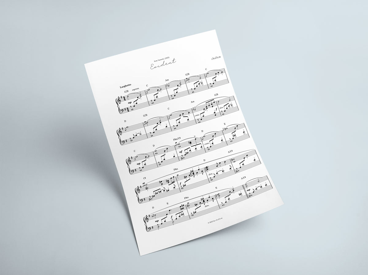 The sheet music for piano of ‘Evident’ by Challem.