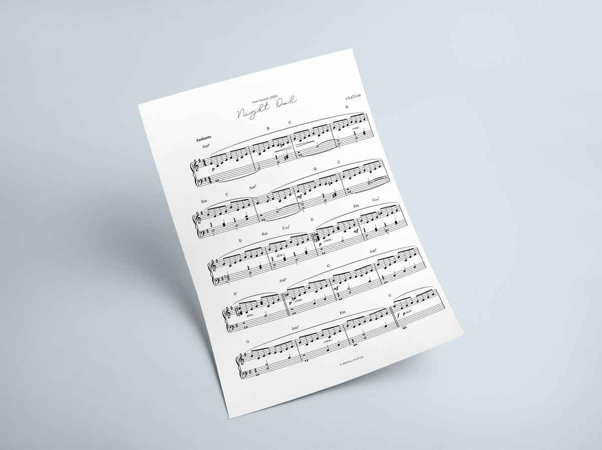 The sheet music for piano of ‘Night Owl’ by Challem.